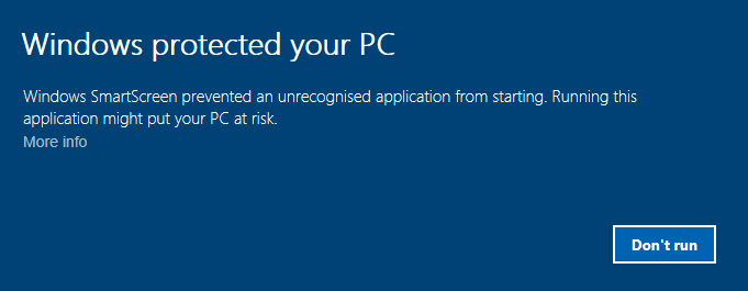If Windows SmartScreen is enabled and you get the following message box, press 'More info'.